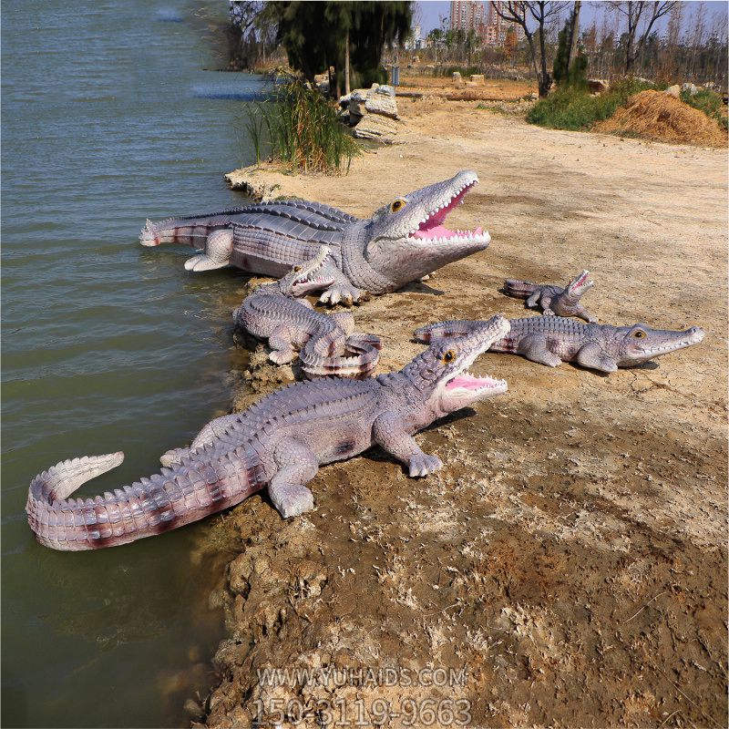 湖邊擺放的兩大兩小的玻璃鋼彩繪鱷魚雕塑.詳細(xì)說明
