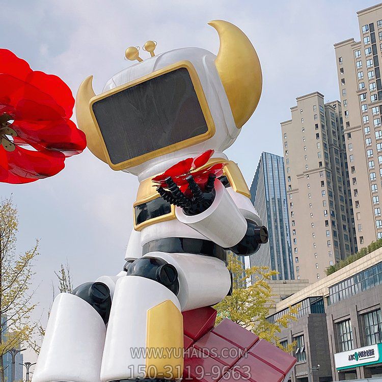 手拿花朵的不銹鋼戶外廣場大型彩繪機器人雕塑 手拿花朵的不銹鋼戶外廣場大型彩繪機器人雕塑