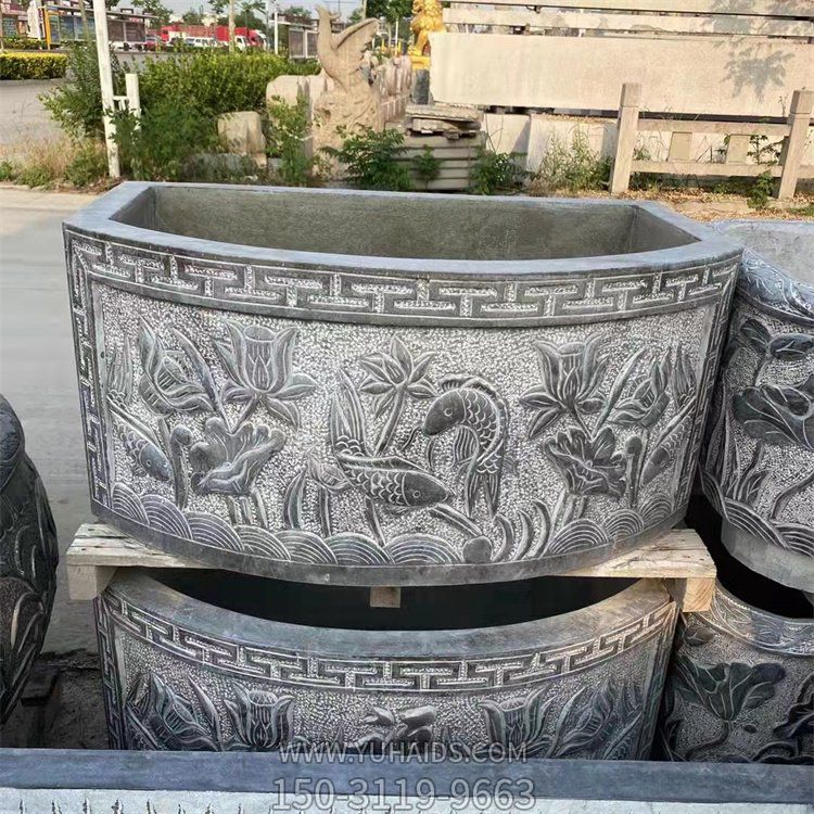 青石雕刻荷花養(yǎng)魚橢圓水缸 庭院室外擺件石花盆雕塑.圖片展示