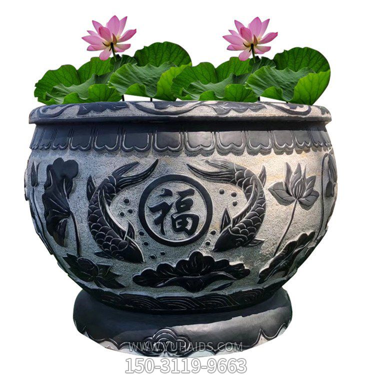 青石浮雕雙魚福字魚缸擺件雕塑.圖片展示