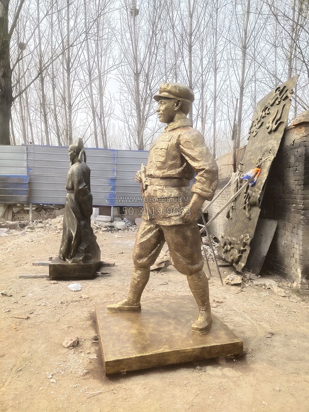 這座雕塑采用玻璃鋼材質(zhì)制作,使用仿銅工藝,讓整個雕塑呈現(xiàn)出仿佛是由黃銅所制成的效果,非常逼真。同時,這種材質(zhì)具有防腐、耐久等優(yōu)點,保證了雕塑的長期保存和不易損壞。雕塑的形態(tài)非常傳神,符志行司令員身穿軍裝,手持槍支,握拳大步前行的姿態(tài),彰顯著他的堅毅與果敢。