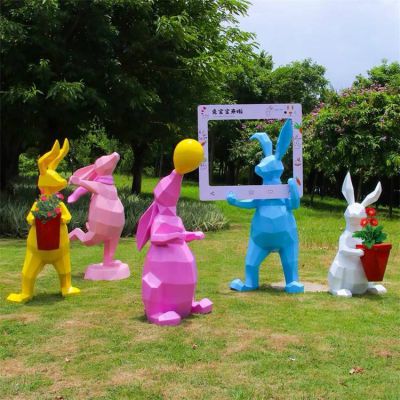 小區(qū)園林卡通玻璃鋼仿真動物手拿花盆的兔子雕塑