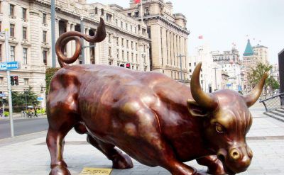 廣場(chǎng)擺放的一只紅褐色的玻璃鋼彩繪華爾街牛