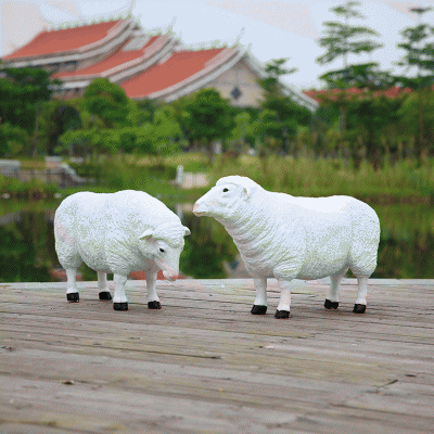 湖邊擺放的兩只玻璃鋼仿真綿羊雕塑