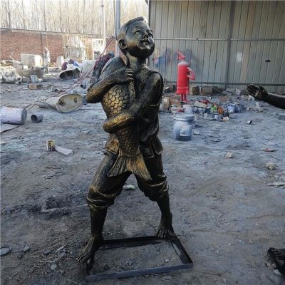 公園景觀玻璃鋼仿銅抱著大魚的兒童景觀