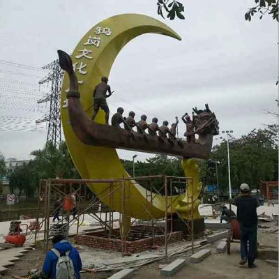 文化廣場擺放大型不銹鋼抽象月亮劃龍舟人物景觀雕塑