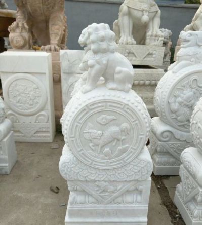 庭院門前擺放漢白玉浮雕獅子雕塑