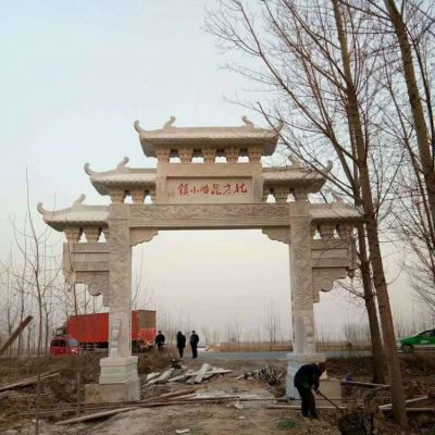 村莊門口擺放青石雕刻門樓牌坊雕塑