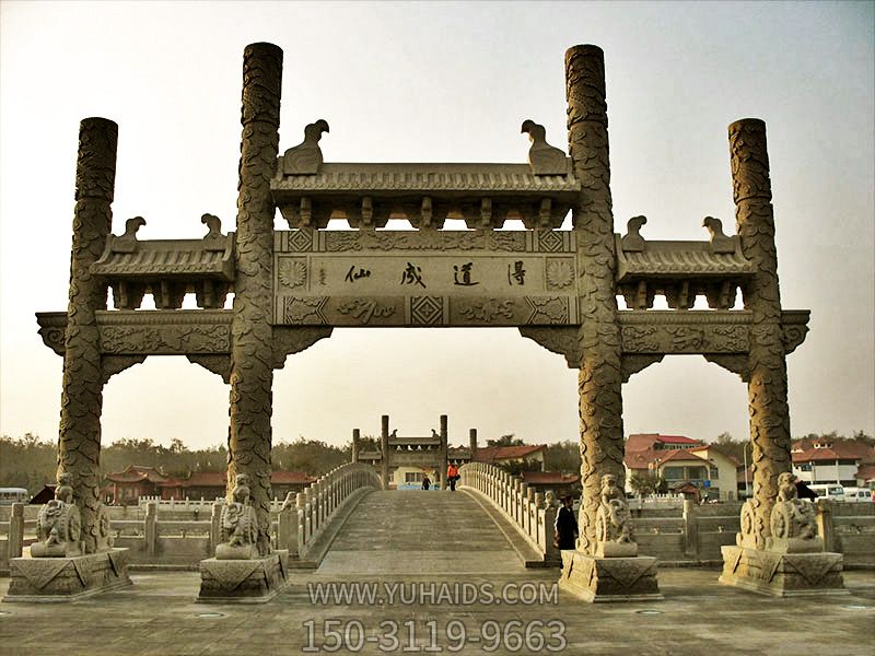 仿古三門四柱浮雕祥云寺廟石雕牌坊雕塑.圖片展示