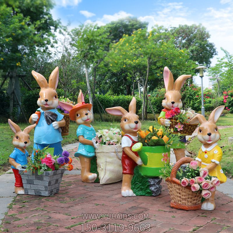 戶外草坪樹脂彩繪一群抱著花盆的兔子雕塑 戶外草坪樹脂彩繪一群抱著花盆的兔子雕塑