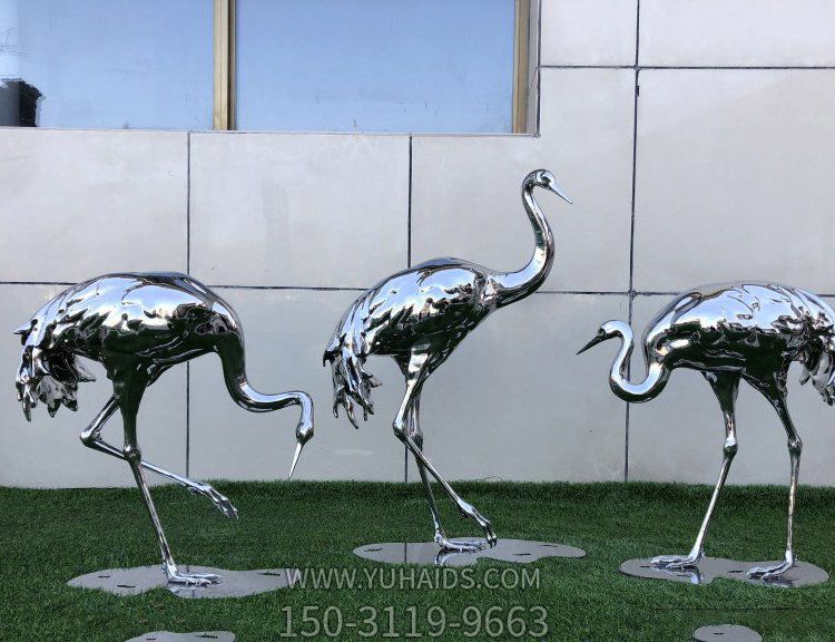 不銹鋼仙鶴雕塑—園林草坪擺放大型動物不銹鋼鏡面仙鶴景觀雕塑.圖片展示