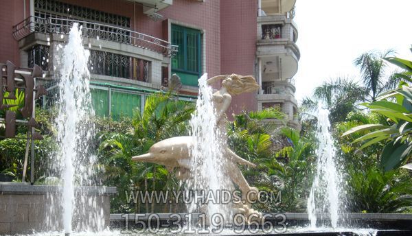 小區(qū)噴泉中跳躍著一只不銹鋼海豚雕塑.詳細說明
