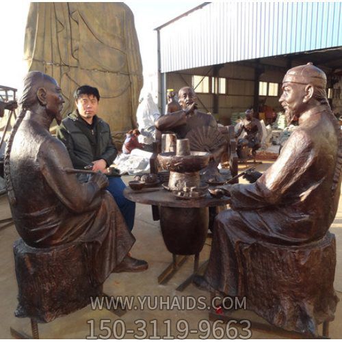 景區(qū)景點(diǎn)玻璃鋼仿銅創(chuàng)意吃火鍋的人物情景雕塑.圖片展示