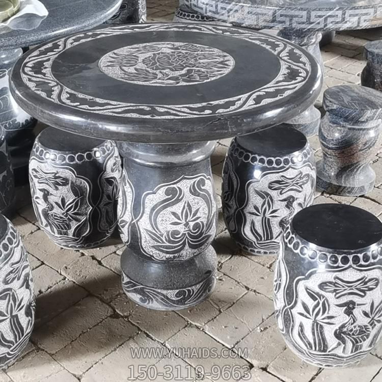 大理石黑浮雕花紋公園戶外擺放休閑石桌石凳雕塑 大理石黑浮雕花紋公園戶外擺放休閑石桌石凳雕塑