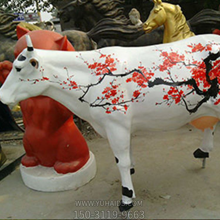 玻璃鋼彩繪梅花牛雕塑景區(qū)商場(chǎng)擺件.詳細(xì)說明
