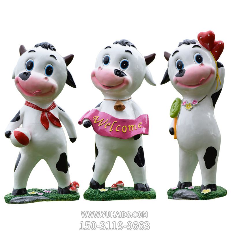 | 產(chǎn)品標(biāo)題 | 花園商廈三只站立的玻璃鋼卡通牛雕塑 |