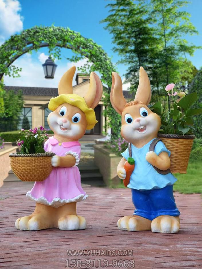 小區(qū)園林卡通玻璃鋼仿真動物手拿花盆的兔子雕塑.圖片展示