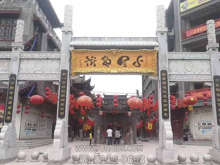 村口擺放青石雕刻簡(jiǎn)易大氣三門五樓牌坊雕塑.圖片展示
