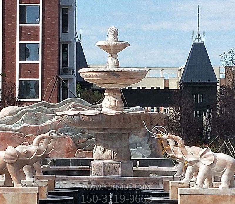 景區(qū)廣場擺放晚霞紅大型噴泉石雕雕塑.圖片展示