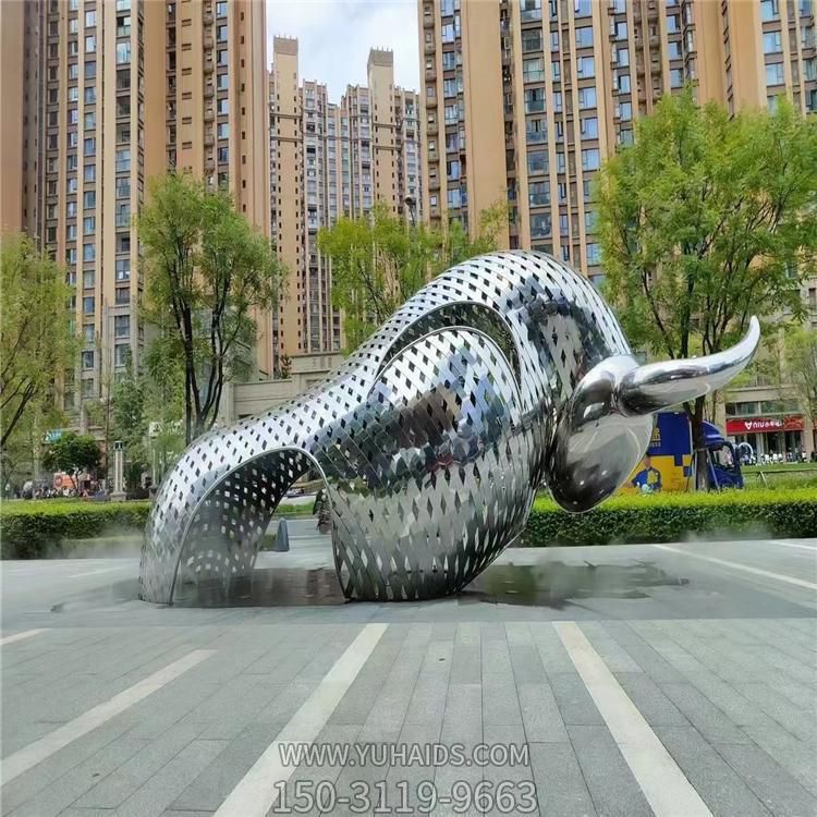 小區(qū)廣場擺放不銹鋼大型鏤空抽象牛動物雕塑.圖片展示