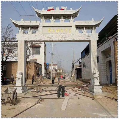 村莊村口擺放大型青石雕刻中式三門樓牌坊雕塑.圖片展示