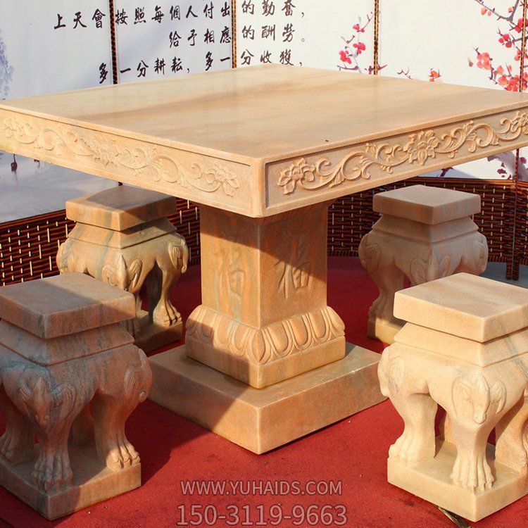 庭院陽臺擺放晚霞紅石雕方形石桌石凳雕塑.圖片展示