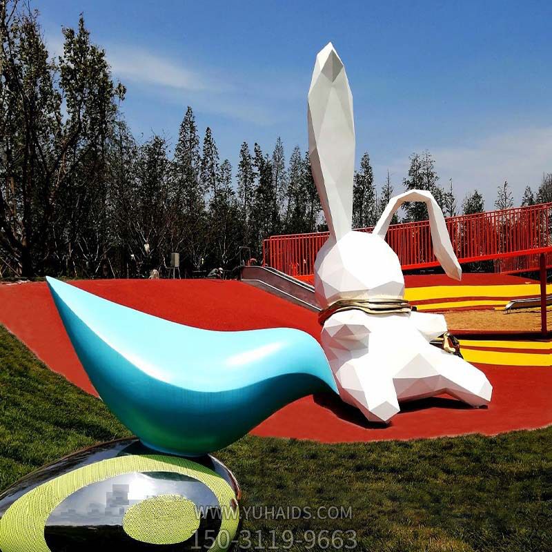 游樂園一只躺著的玻璃鋼白色兔子雕塑.圖片展示