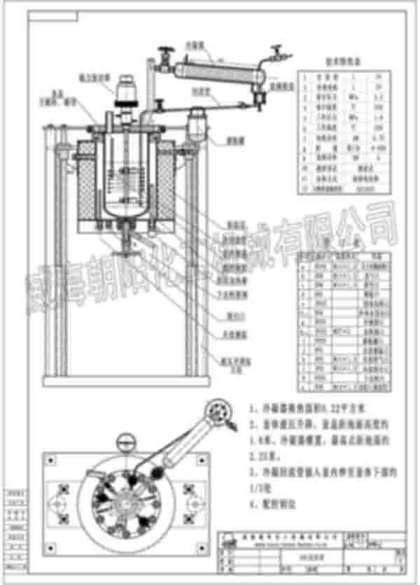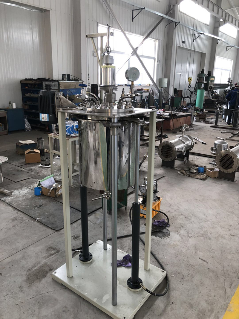 我公司為江蘇地區(qū)客戶制作的20L反應(yīng)釜。設(shè)備采用磁力驅(qū)動(dòng)攪拌器配推進(jìn)式攪拌槳葉,攪拌轉(zhuǎn)速為500r/min。反應(yīng)釜設(shè)計(jì)溫度達(dá)240℃,設(shè)計(jì)壓力為2.2MPa。制造材質(zhì)為不銹鋼S31603。該設(shè)備配備了冷凝回流裝置。釜內(nèi)配備冷卻水盤(pán)管。此設(shè)備釜蓋為框架固定,釜體配電動(dòng)液壓裝置升降。